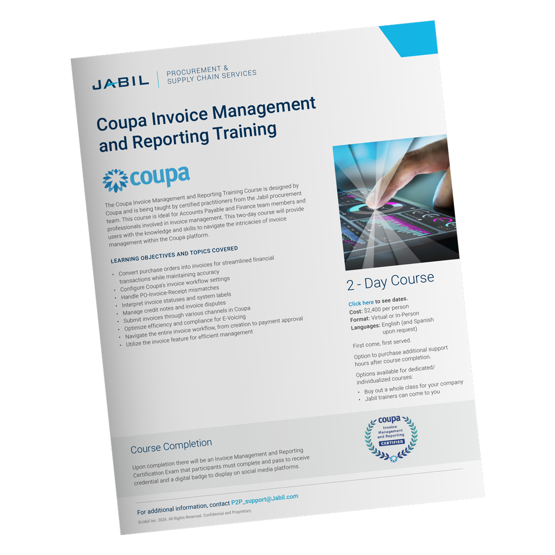 Jabil now offers comprehensive training and certification for Coupa Invoice Management and Reporting!