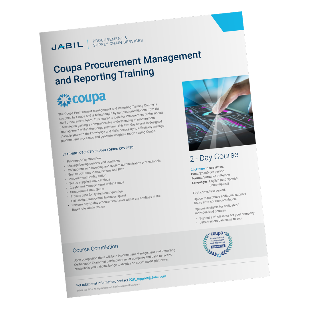 Jabil now offers comprehensive training and certification for Coupa Procurement Management and Reporting!